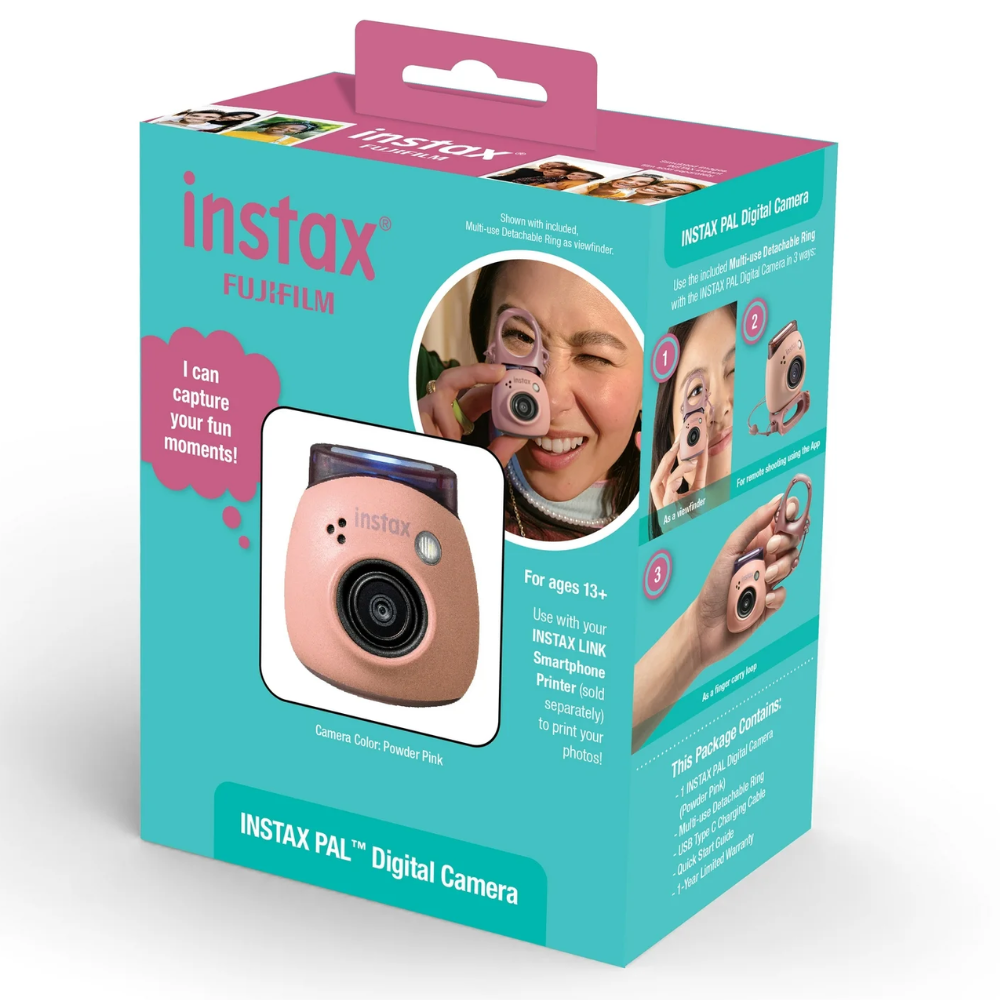 The Fujifilm Instax Pal Digital Camera (Pink Blister) is a compact and lightweight digital camera designed for capturing and sharing moments effortlessly. Its petite dimensions and weight make it highly portable, fitting comfortably in the palm of your hand or pocket.​