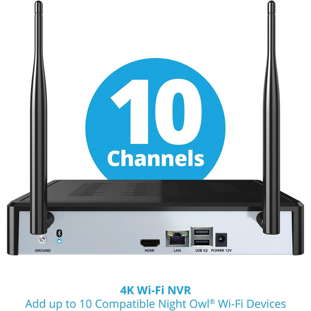 The Night Owl 10 Channel 4K Wi-Fi NVR with 1TB Hard Drive and 3 Wire-Free 1080p HD Spotlight Cameras is a comprehensive security solution designed for homes or businesses. With support for up to 10 channels, this system offers crystal-clear 4K video resolution for a detailed and accurate view of your property. The included wire-free cameras come equipped with 1080p HD resolution and integrated spotlight functionality to capture clear footage day or night. The NVR’s 1TB hard drive provides ample storage, allowing you to store weeks of footage with ease. Its Wi-Fi connectivity ensures simple installation and setup, while the advanced motion detection and remote access features give you peace of mind, whether you’re at home or on the go. With its easy-to-use interface and mobile app compatibility, the Night Owl security system is the perfect way to protect what matters most.